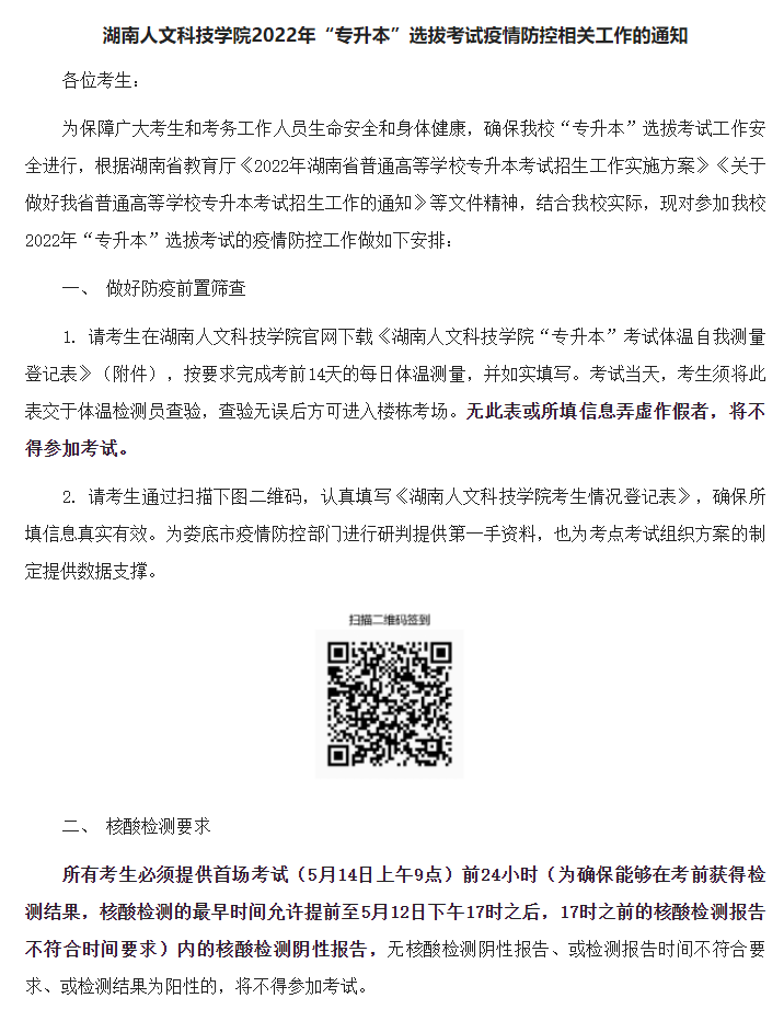 所有参加专升本招生考试的学生需提供入郴前48小时核酸检测报告阴性证明、入郴后3小时内核酸检测报告阴性证明(以上证明截屏备查);考试当天入校门时,需提供48小时核酸检测报告阴性证明,湖南省居民健康码(绿码),行程卡(显示14天内行程在湖南省内且无中高风险地区旅居史)。入校时由校门口疫情防控工作人员核验核酸检测报告、健康码、行程卡,测体温,体温无异常后,在准考证上登记好学生体温并盖章。接受体温测量时须有序进行,严格控制人员行进速度和间距。