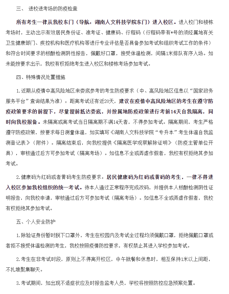 所有参加专升本招生考试的学生需提供入郴前48小时核酸检测报告阴性证明、入郴后3小时内核酸检测报告阴性证明(以上证明截屏备查);考试当天入校门时,需提供48小时核酸检测报告阴性证明,湖南省居民健康码(绿码),行程卡(显示14天内行程在湖南省内且无中高风险地区旅居史)。入校时由校门口疫情防控工作人员核验核酸检测报告、健康码、行程卡,测体温,体温无异常后,在准考证上登记好学生体温并盖章。接受体温测量时须有序进行,严格控制人员行进速度和间距。
